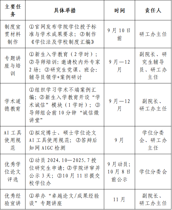 一是在学院官网公布学院学位授予标准与学术成果要求,并于2025年9月前完成备案。二是制作《学位法及学校制度汇编》(电子版),通过微信群、邮件、班会等方式推送至全体研究生与导师。