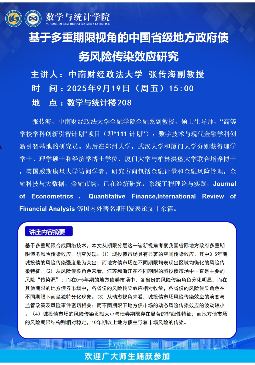 中南财经政法大学张传海副教授-基于多重期限视角的中国省级地方政府债务风险传染效应研究