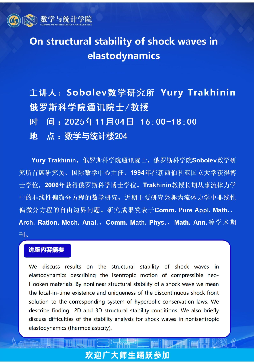 俄罗斯科学院通讯院士Yury Trakhinin-On structural stability of shock waves in elastodynamics