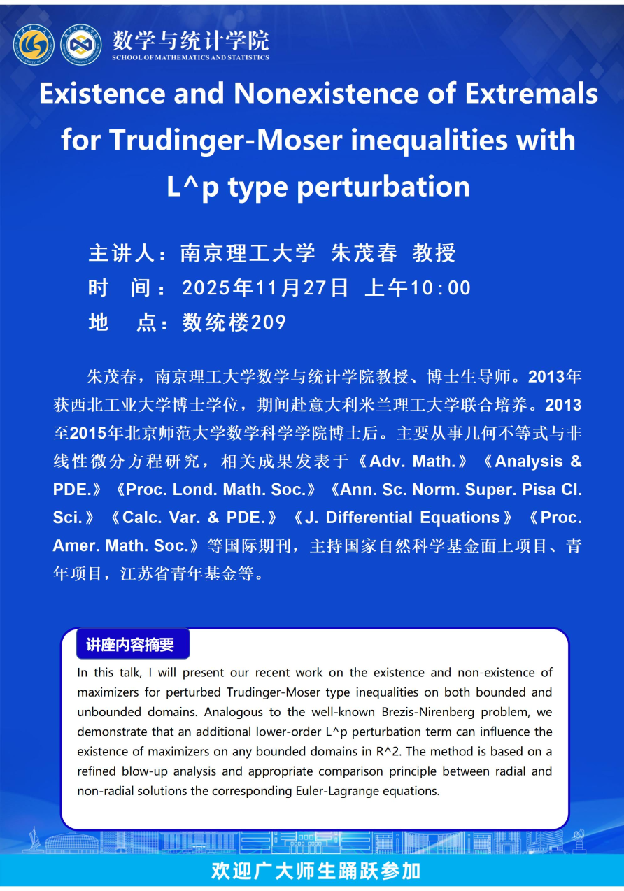 南京理工大学朱茂春教授-Existence and Nonexistence of Extremals for Trudinger-Moser inequalities with L^p type perturbation 发布日期:2025-11-26