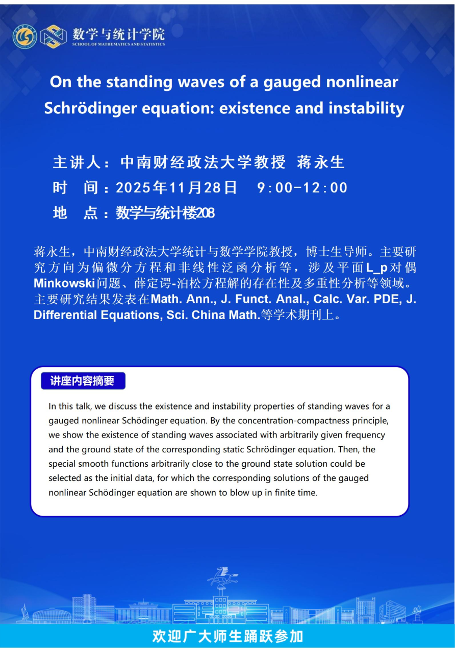 中南财经政法大学教授 蒋永生-On the standing waves of a gauged nonlinear Schrödinger equation: existence and instability 发布日期:2025-11-27