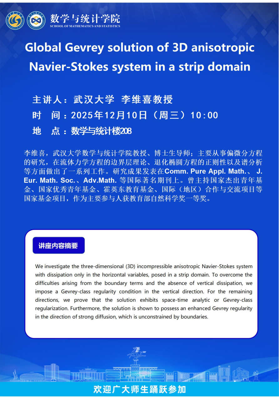 武汉大学 李维喜教授-Global Gevrey solution of 3D anisotropic Navier-Stokes system in a strip domain 发布日期:2025-12-09