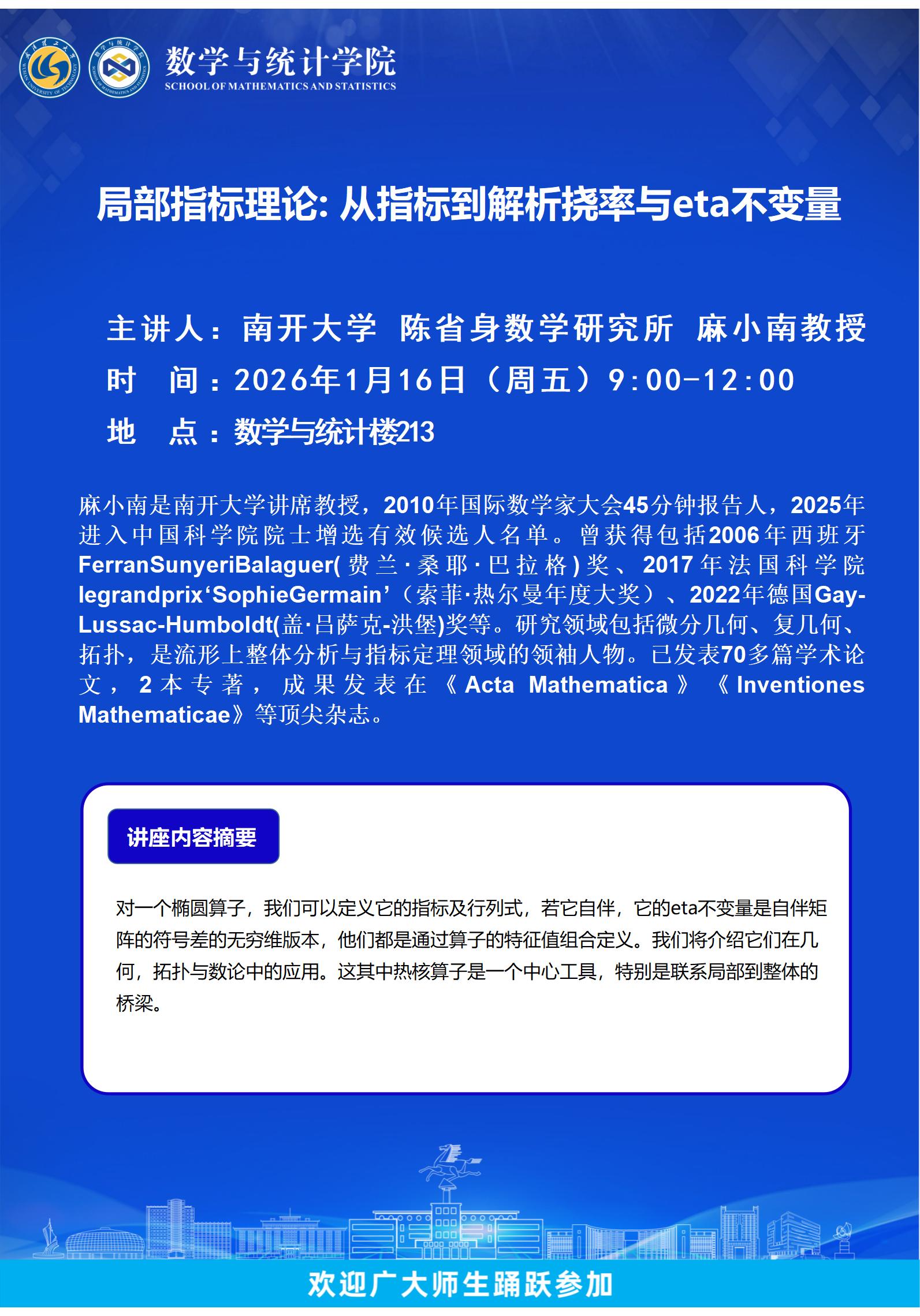 南开大学 陈省身数学研究所 麻小南教授-局部指标理论: 从指标到解析挠率与eta不变量
