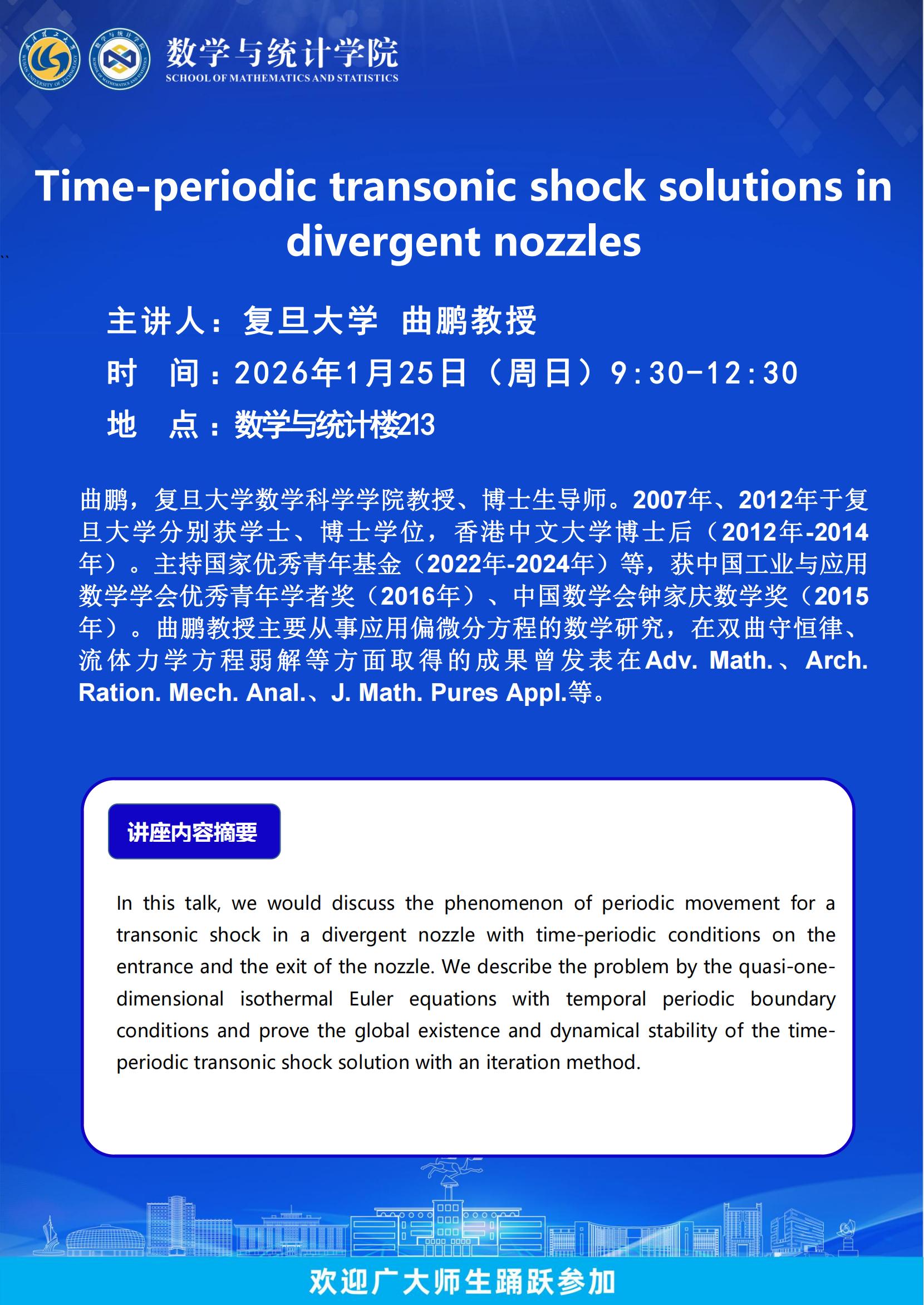 复旦大学 曲鹏教授-Time-periodic transonic shock solutions in divergent nozzles