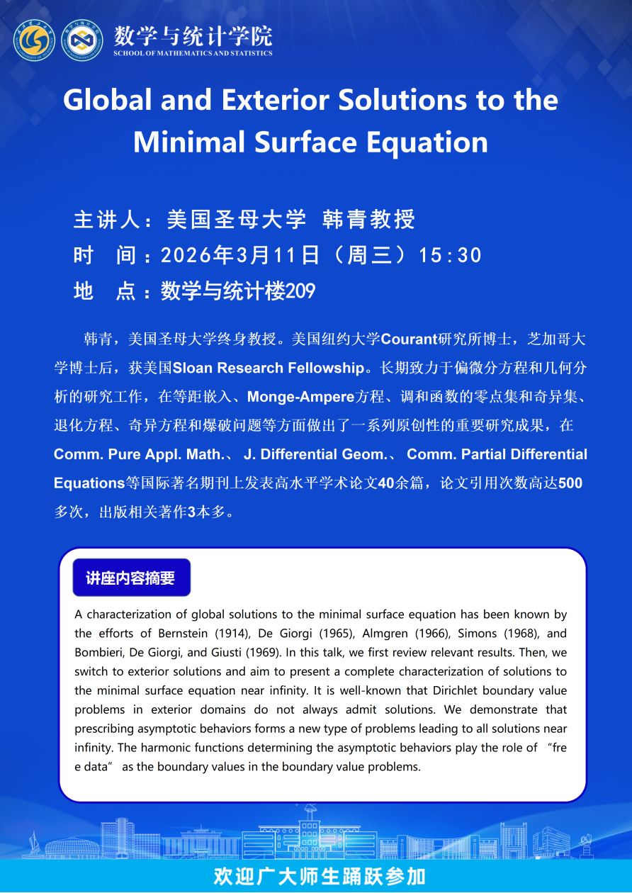 【数统学院】美国圣母大学韩青教授-Global and Exterior Solutions to the Minimal Surface Equation