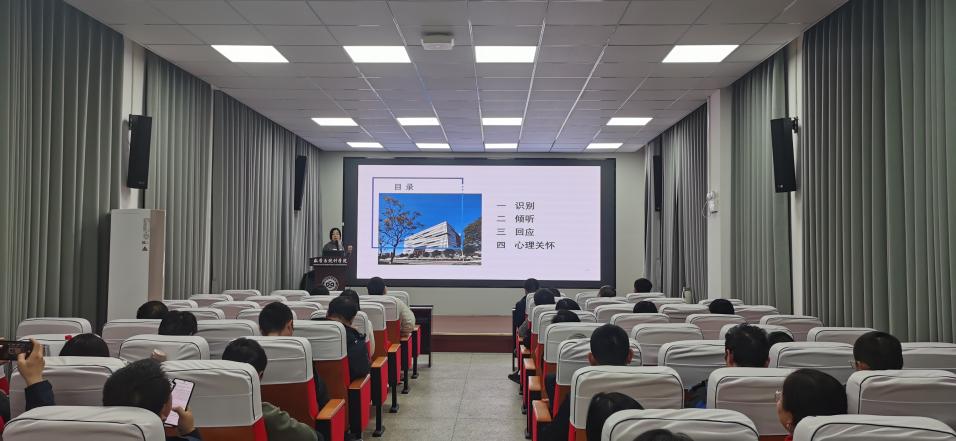 陈震宇老师以“大学生心理问题的识别与干预”为主题,展开了系统而深入的讲解。首先解读了当代大学生群体中普遍存在的几类主要心理困扰及其核心特征,剖析了其背后的学业压力、人际适应、生涯发展等多重诱因,指导班主任、导师如何从学生的生活及学业表现中捕捉预警信号,实现早期预警与精准识别。她强调,及时的发现是有效干预的第一步,而科学的倾听与回应则是建立信任的关键桥梁。陈老师通过场景模拟,详细演示了如何与学生进行有温度的沟通,引导其寻求专业帮助。
