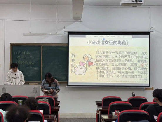 数学类2501班以沉浸式体验让同学们在互动中汲取心理能量。活动开篇的心灵盲盒环节温情满满,同学们将匿名书写的鼓励话语投入盒中随机交换,“别怕暂时的迷茫,你一直很出色”“每一次努力都值得被看见”等真挚寄语,瞬间消融了彼此间的距离,让教室充满暖意。