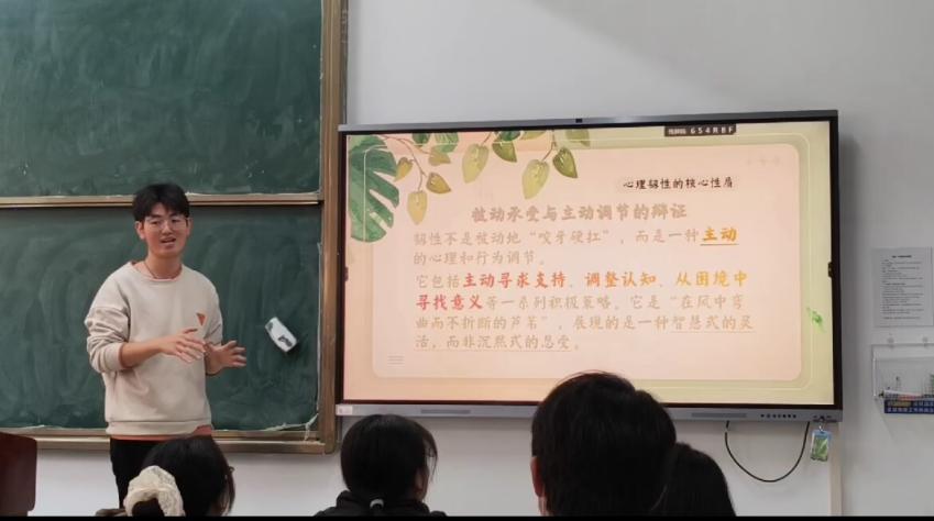 数学类2502班以趣味互动的形式传递韧性成长理念。活动以歌曲《左手右手》与韧性名言开场,引发思考;通过词语褒贬补全小游戏,帮助同学们辨析积极与消极的应对方式。在班长胡冰协助下,便签心声环节成为高潮——同学们分享学习遇瓶颈等困扰或首次独立解出难题等喜悦,现场互动热烈,并借由品尝寓意同甘共苦的怪味胡豆,深化班级情感联结。