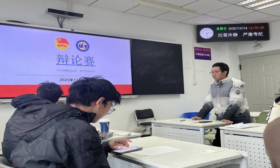 发布日期:2025-12-152025年12月14日,信计鲲鹏2501班与数学类2501班辩论赛顺利开展。本次辩论赛以“精神成长中,情感联结的人性滋养与智慧工具的理论支撑何者更具本质价值”为辩题,在班主任向建林老师的指导下,由团支书董楚赫统筹组织,为两班同学带来了一场思想碰撞、精彩纷呈的思辨盛宴。