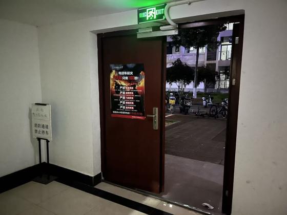 对卓园五栋、越园六栋公共区域进行检查,张贴物已基本完成拆除改造,公共区域无占用消防通道行为。消防门完好未损坏,已与宿管阿姨确认,每晚23:00后将按时关闭。