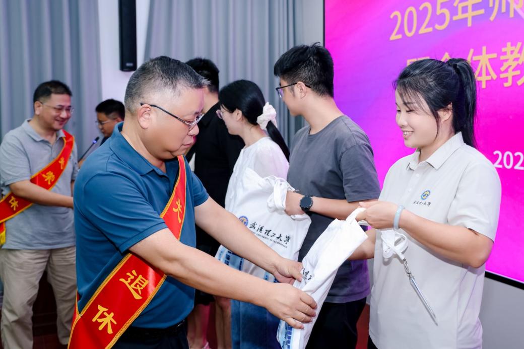 师道赓续,薪火相传。荣休教师代表王卫华、王伟沧老师为新入职的青年教师赠送院服。一件院服,不仅承载着学院的温暖与关怀,更象征着教育使命的接续与师道精神的传承,寄托着老一辈教师对青年教师的殷切期望。