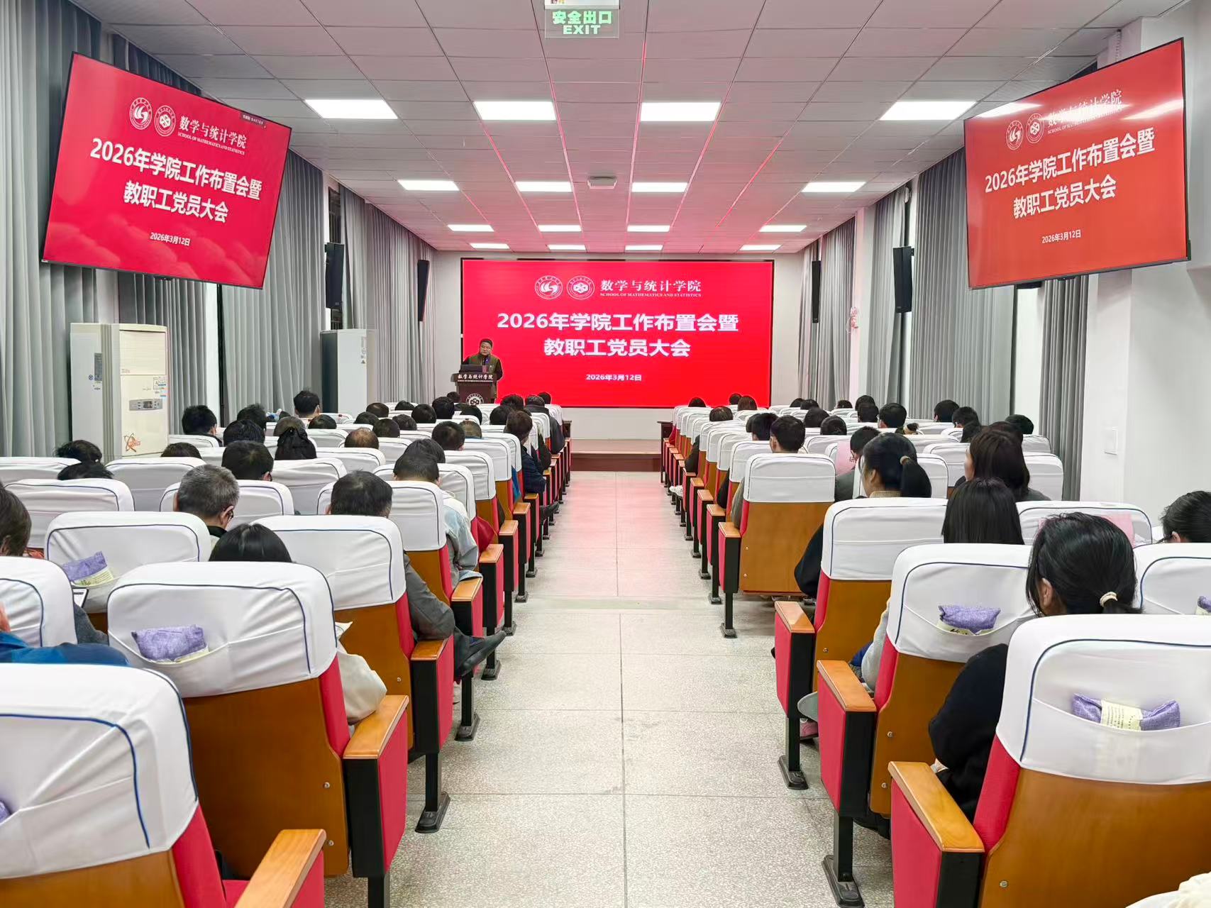 发布日期:2026-03-133月12日,数统学院在108报告厅召开学院2026年工作布置会暨教职工党员大会。会议由院党委书记王佩佩主持,学院领导班子及全体教职工参加会议。