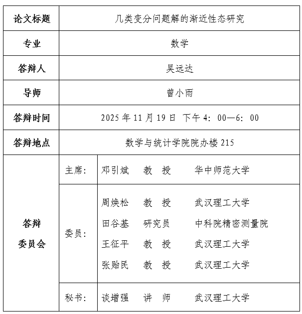 【数学与统计学院】博士学位论文答辩公告(吴远达)