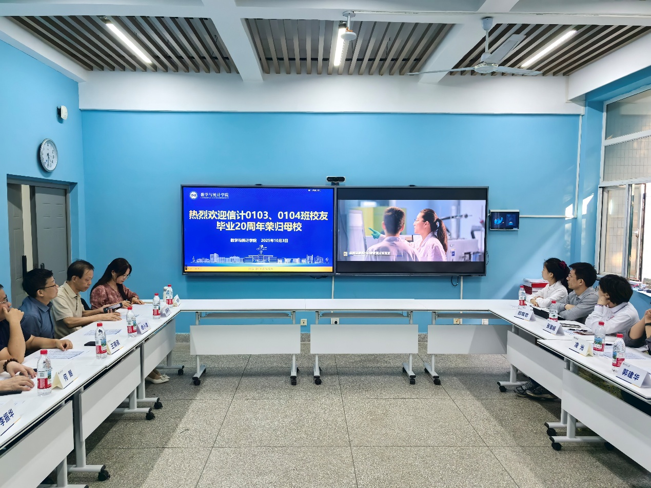 发布日期:2025-10-1310月3日下午,数学与统计学院于学院215会议室举行信息与计算科学专业01级毕业20周年返校交流座谈会。学院院长何朗、党委书记王佩佩、副书记李振华,信计01级辅导员、后勤管理处副处长徐小波,信计0104班英语老师王爱军,数学系班子成员及教师代表参加了座谈会。会议由学院党委副书记李振华主持。